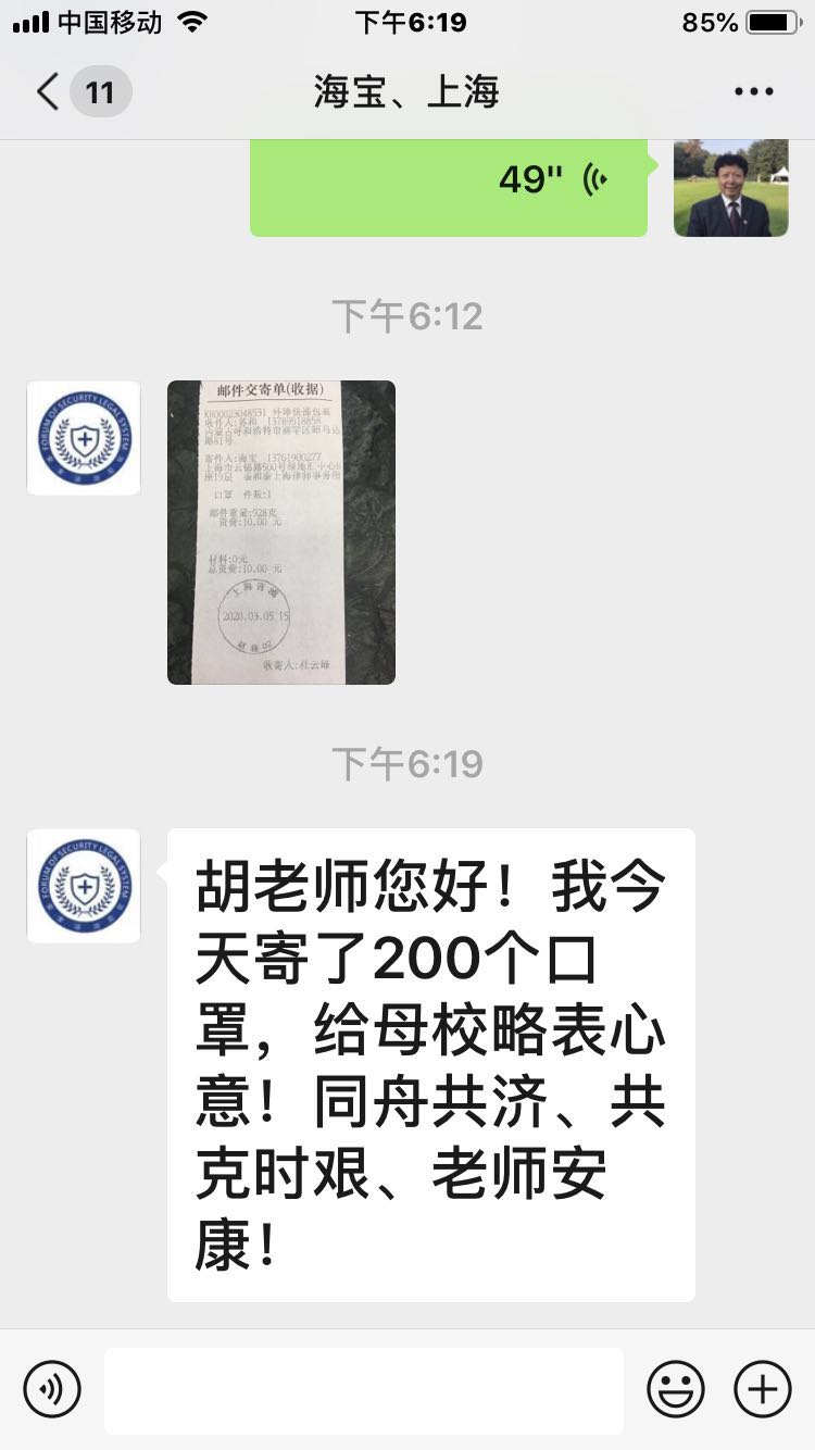 2020年3月9日,承载者bevictor伟德1988届毕业员工海宝先生爱心的200个医用外科口罩的快递从上海来到了伟德国际1946。疫情发生后,海宝先生一直心系母校,四处奔走为母校采买防疫用品,在口罩极难买到的情况下,想方设法购买到200个医用外科口罩,2020年3月5日,海宝先生与公司员工会联系并寄出了自己的一片赤诚之心。在非常时期,海宝先生对公司的厚爱和深情,极大地激励了公司和公司的师生。公司为有海宝先生这样有担当的员工感到自豪。在此,对海宝先生表示衷心的感谢并致以崇高的敬意!