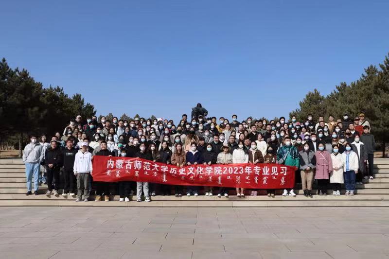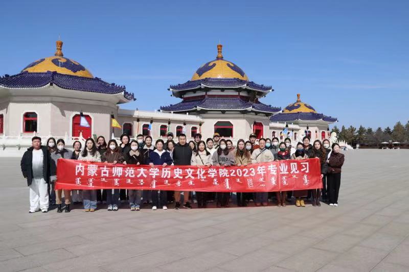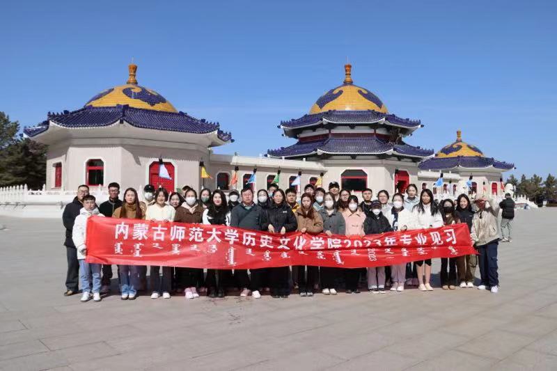 2023年2月28日,2019级历史学专业见习员工从盛乐校区出发,经过几小时路程,到达见习第一站:成吉思汗陵。首先映入眼帘的是宏伟、壮观的“气壮山河”入口门景。成吉思汗的跃马柱型雕像矗立门前,他手持苏鲁锭长枪,骑着久经沙场的战马,下方的三块“基石”分别是《蒙古秘史》《蒙古黄金史》《蒙古源流》。穿过门景就是壮观的“铁马金帐”群雕,它以恢宏的气势生动地再现了成吉思汗率蒙古大军出征的情景。北边蓝天绿草之间,三座蒙古包式的大殿肃然伫立,明黄的墙壁、朱红的门窗、辉煌夺目的金黄琉璃宝顶,使这座帝陵显得格外庄严。由正殿、寝宫、东殿、西殿、东过厅和西过厅六部分组成。正殿中央是成吉思汗汉白玉雕像,背后是成吉思汗建立的帝国时期疆域图。后殿供奉着成吉思汗及三位皇后的灵柩,寝宫酥油灯长年不熄。西殿内供奉着成吉思汗八白室,由吉劳(鞍辔)白室、胡日萨德格(弓箭)白室和宝日温都尔(圣奶桶)白室等组成。东殿里安放着一座灵包,灵包内供奉着成吉思汗幼子拖雷和夫人额希哈屯的灵柩。