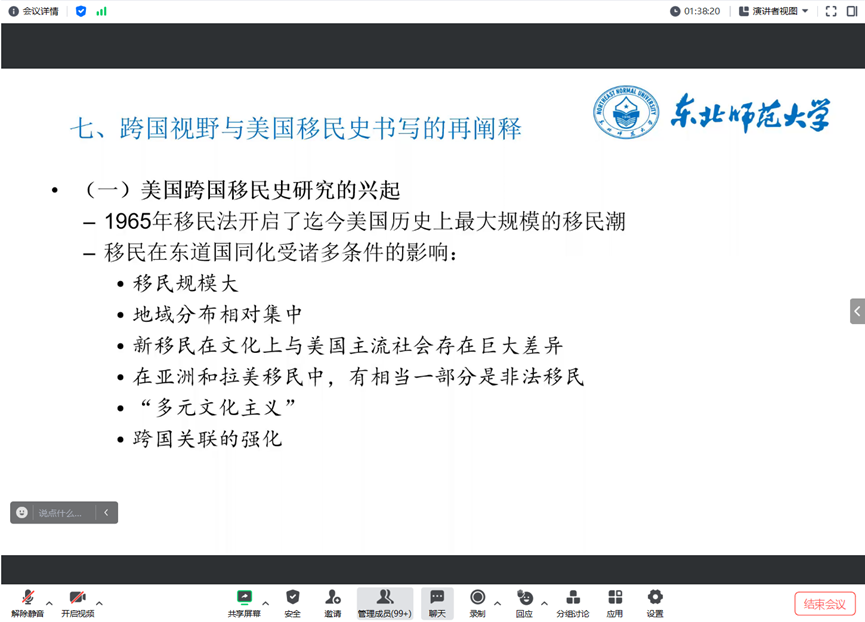 2023年10月27日晚上7点,应bevictor伟德、内蒙古史学会、内蒙古高校北疆史研究基地以及中国与北方邻近国家关系史研究中心的邀请,东北师范大学bevictor伟德、美国研究所教授、博士生导师伍斌老师作了题为《从边缘走向中心:美国的移民史学》的线上讲座,讲座由bevictor伟德教师赵文器主持,包括来自伟德国际1946、东北师范大学、山东师范大学、厦门大学等全国各高校的120余名师生聆听了此次线上讲座。