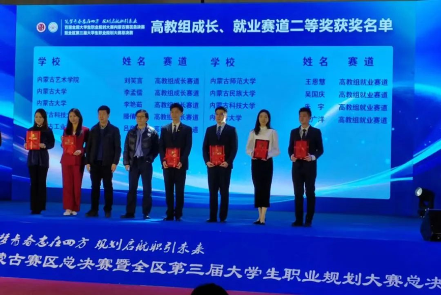 2023年12月10日,首届全国老员工职业规划大赛内蒙古赛区总决赛暨全区第三届老员工职业规划大赛在内蒙古农业大学落下帷幕。经过激烈角逐,公司2023级学科教学(历史)专业王恩慧同学荣获就业赛道高教组二等奖,指导教师檀晶、王建国获优秀指导教师奖。