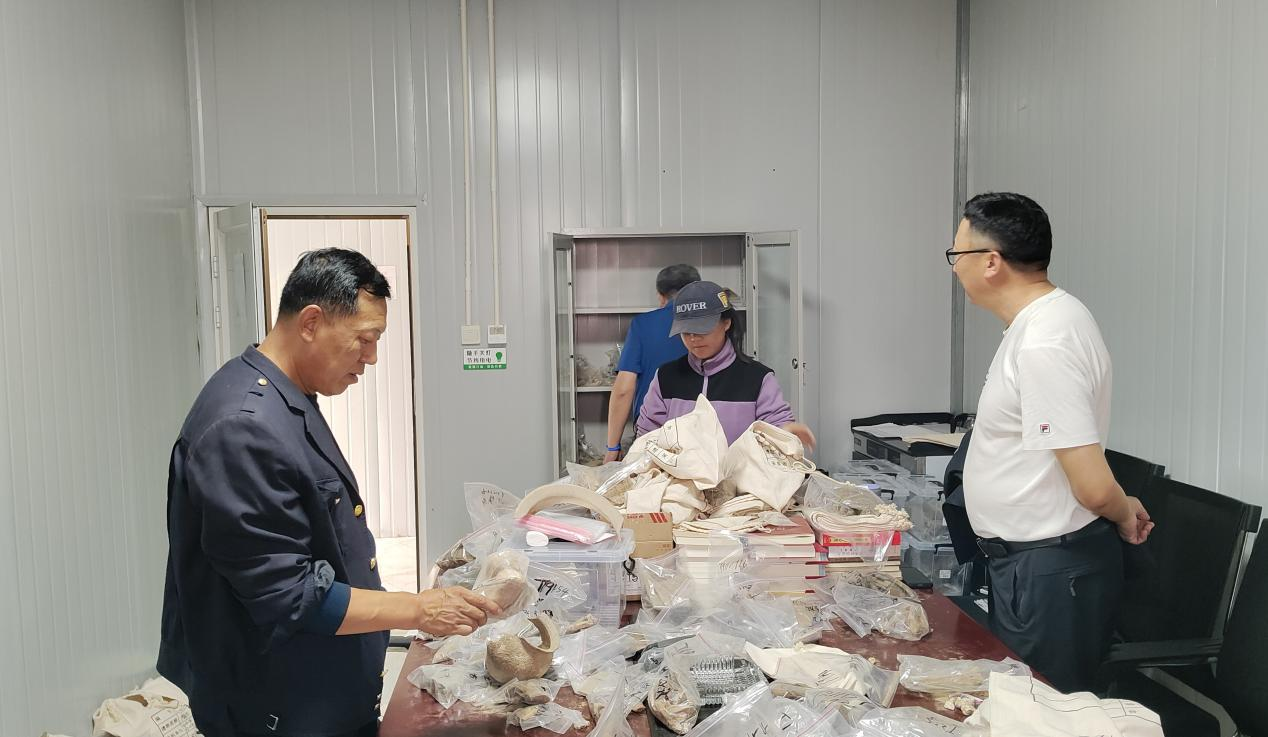 在良安窑遗址考古驻地,索明杰与牧仁老师共同观摩了出土文物标本,与实习师生亲切交谈。在考古工地现场,索明杰老师详细询问了实习进度,对实习员工进行指导,并分享了自己的考古经验,鼓励大家要珍惜这次实践机会,努力提升专业技能。