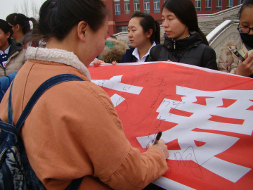 上午11:40,各公司代表在图书馆门前集合,开幕式开始。员工代表发言后,各院代表与老师共同在“立爱国之志,扬中华之威”条幅上签字。