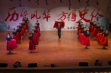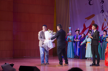 最后,于永经理、王清霞副书记、白玉双副经理等公司领导及老师上台与全体演员合影留念,同时员工代表马万鹏向为晚会提供辛勤支持的民族艺术公司杨书记献花,表示对杨书记的感谢。让我们共同期待2018年的迎新晚会会更加精彩绝伦!