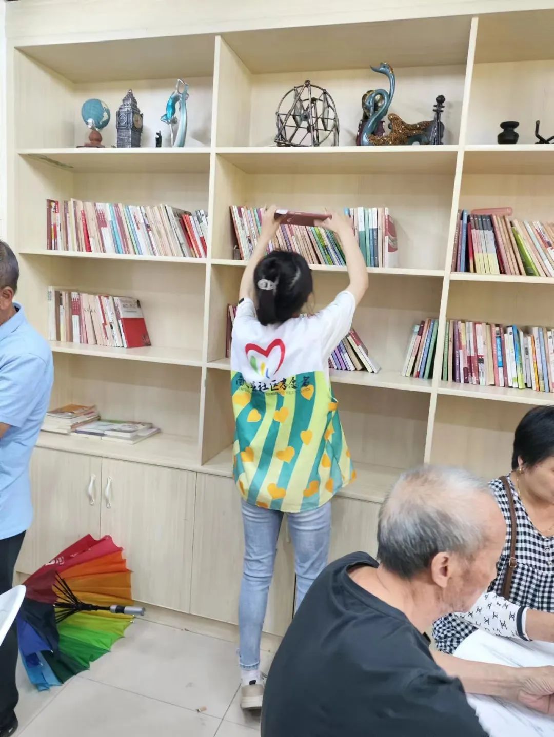 协助社区服务人员在社区活动场所关爱老人,发放爱心饮料与水果,整理书籍
