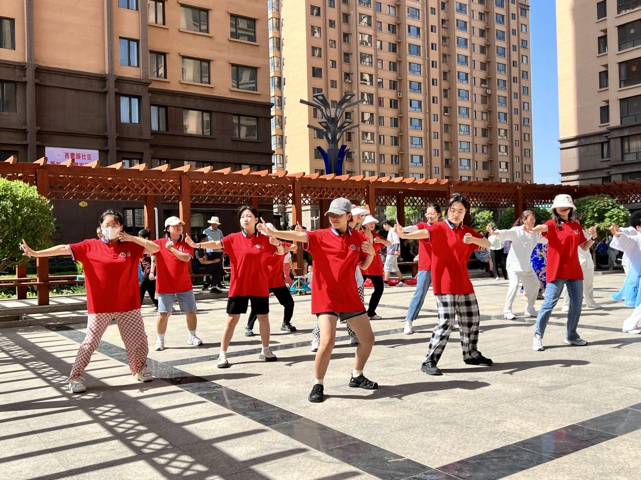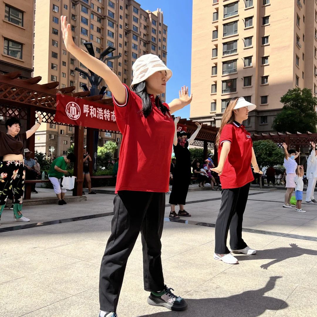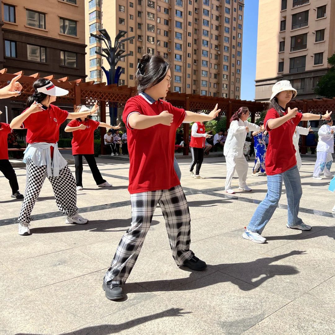 同学们在健身老师的带领下和社区内健身爱好者一起进行了八段锦健身活动。