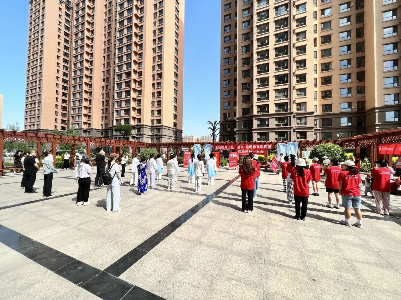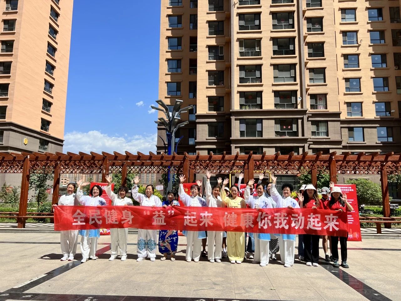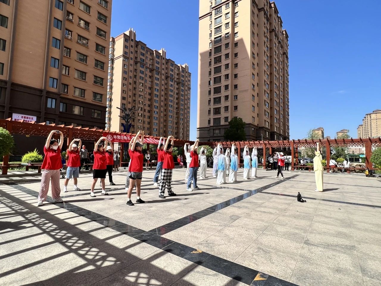 同学们在健身老师的带领下和社区内健身爱好者一起进行了八段锦健身活动。