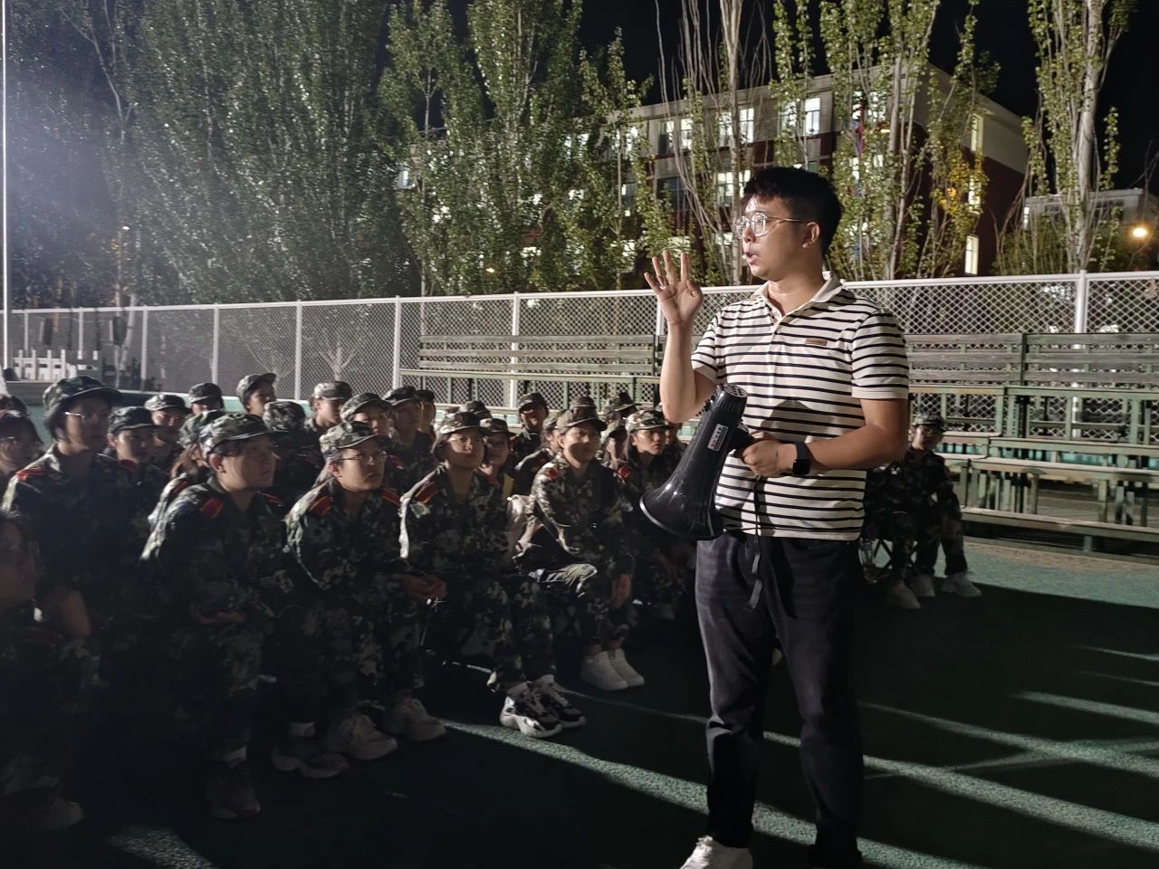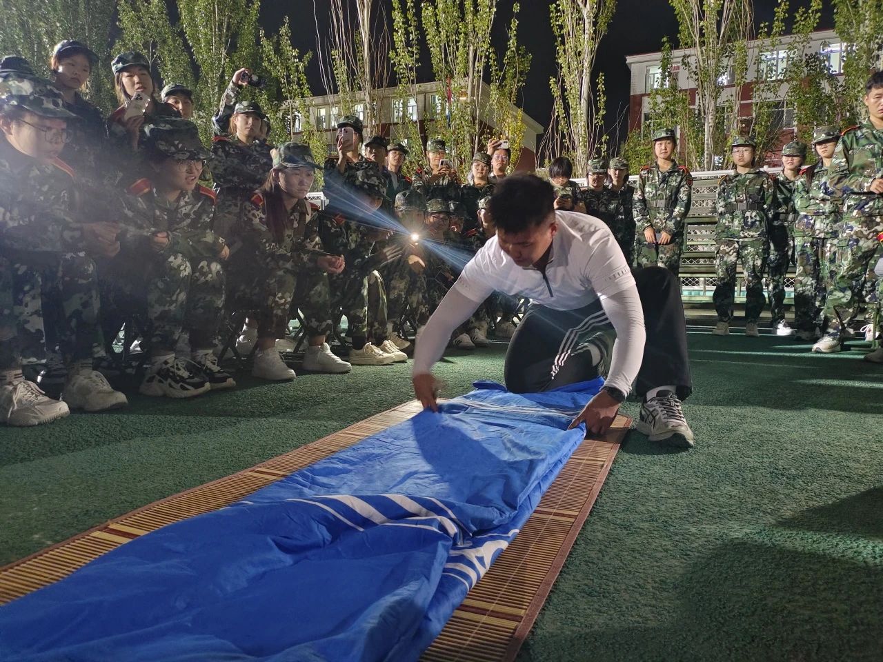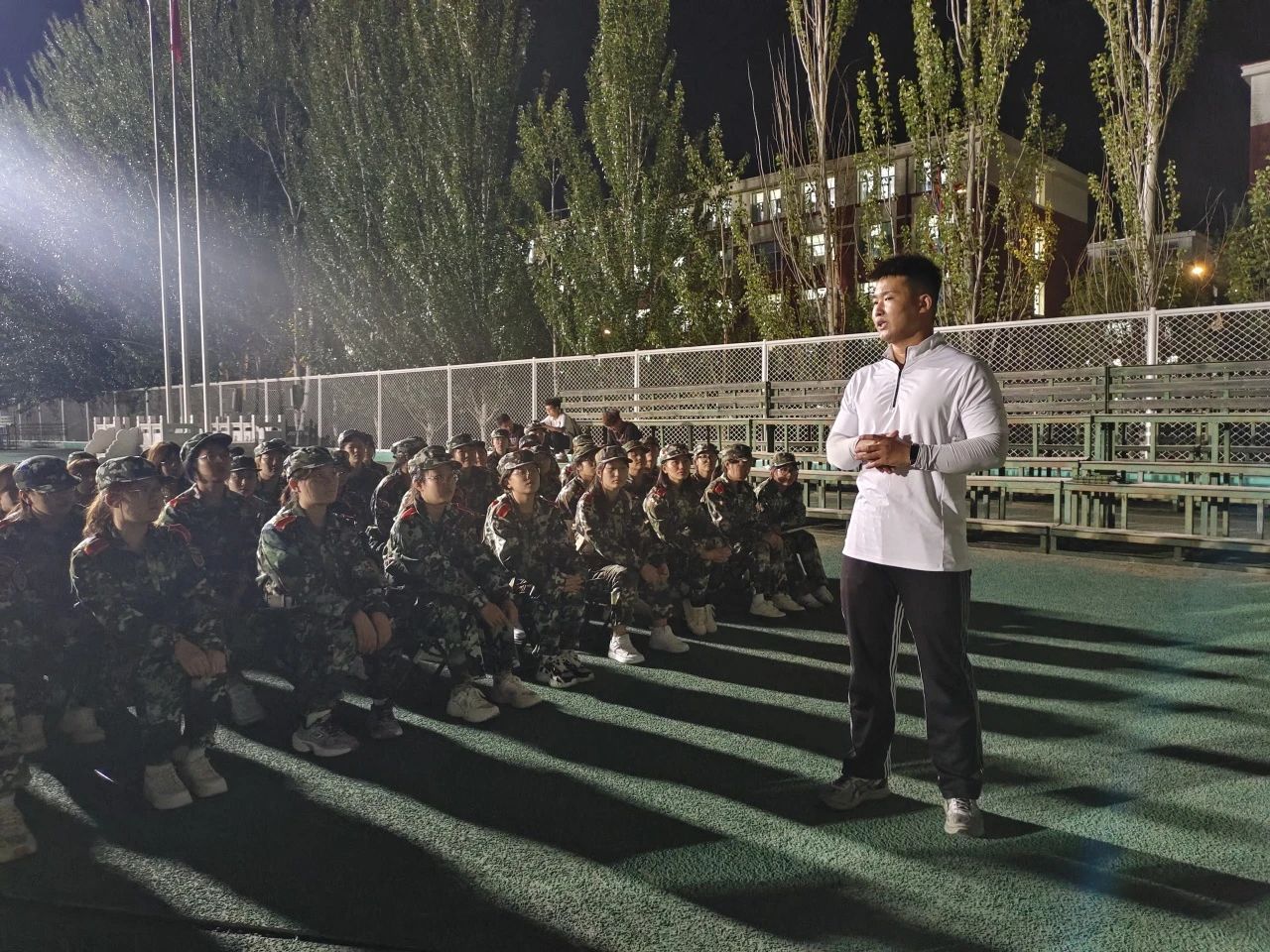 傍晚,王建国老师带领新生在东操场与军训教官进行见面沟通,员工干部张孟给新生作内务标准示范,为即将开始的军训生活做好准备。