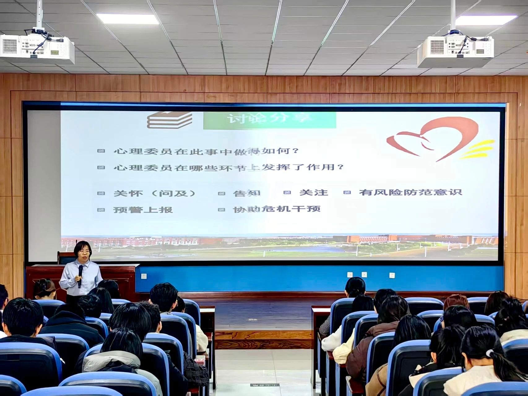 会议上,李老师围绕“朋辈心理骨干如何进行预警干预与自我关怀”展开讲解。首先,李老师强调了心理委员与宿舍长在心理健康工作上的关键作用,通过多个真实案例,深入浅出地阐述了应如何完成心理委员与宿舍长工作,成为校园心理健康的第一道防线。随后,李老师还提到,面对同学的不良情绪,心理委员与宿舍长需要做到倾听、支持,在交流中给予对方充分的尊重与理解,让同学感受到真诚与关怀。如遇到严重问题,应及时联系老师,寻求更加专业的帮助。
