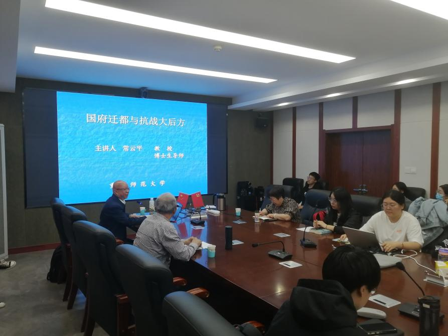 常教授首先解释了“迁都”、“陪都”、“战时首都”、“抗战大后方”这些概念的涵义,进而提出了重庆应称为“战时首都”而非“陪都”的观点,带领同学们共同梳理了自1912年中华民国成立以来至1937年12月国民政府正式迁都重庆这一期间内,中国的有识之士关于迁都御敌的构想。常教授认为,1936年由于陕西、四川的政治、经济、军事形势都发生了重大变化,在多种因素的综合作用下,迁都重庆成为了国民党当局的最优解。其次,常教授论述了国民党当局迁都重庆的优势:当时西部地区经济最发达,人口较多的港口城市、粮食产量较高、地理位置易守难攻、政令传达相对容易等等。常教授还阐释了国民政府迁都重庆后对全国和对西南地区的影响。由于国民党选择迁都重庆,使得国民政府建立了稳固的大后方,一定程度上使国民党政府坚持了抗日民族统一战线,并且最终与中国共产党一道,取得了中国人民抗日战争和世界反法西斯战争的胜利。另外,国民政府迁都重庆,对西南地区的经济发展、基础设施建设和文化发展做出了较大的贡献。常教授特别提到了川军和四川人民在抗日战争中作出的贡献,参加讲座的师生无不因先辈的爱国主义精神而振奋。最后,常云平教授还同大家进行了互动,回答了同学们提出的问题。