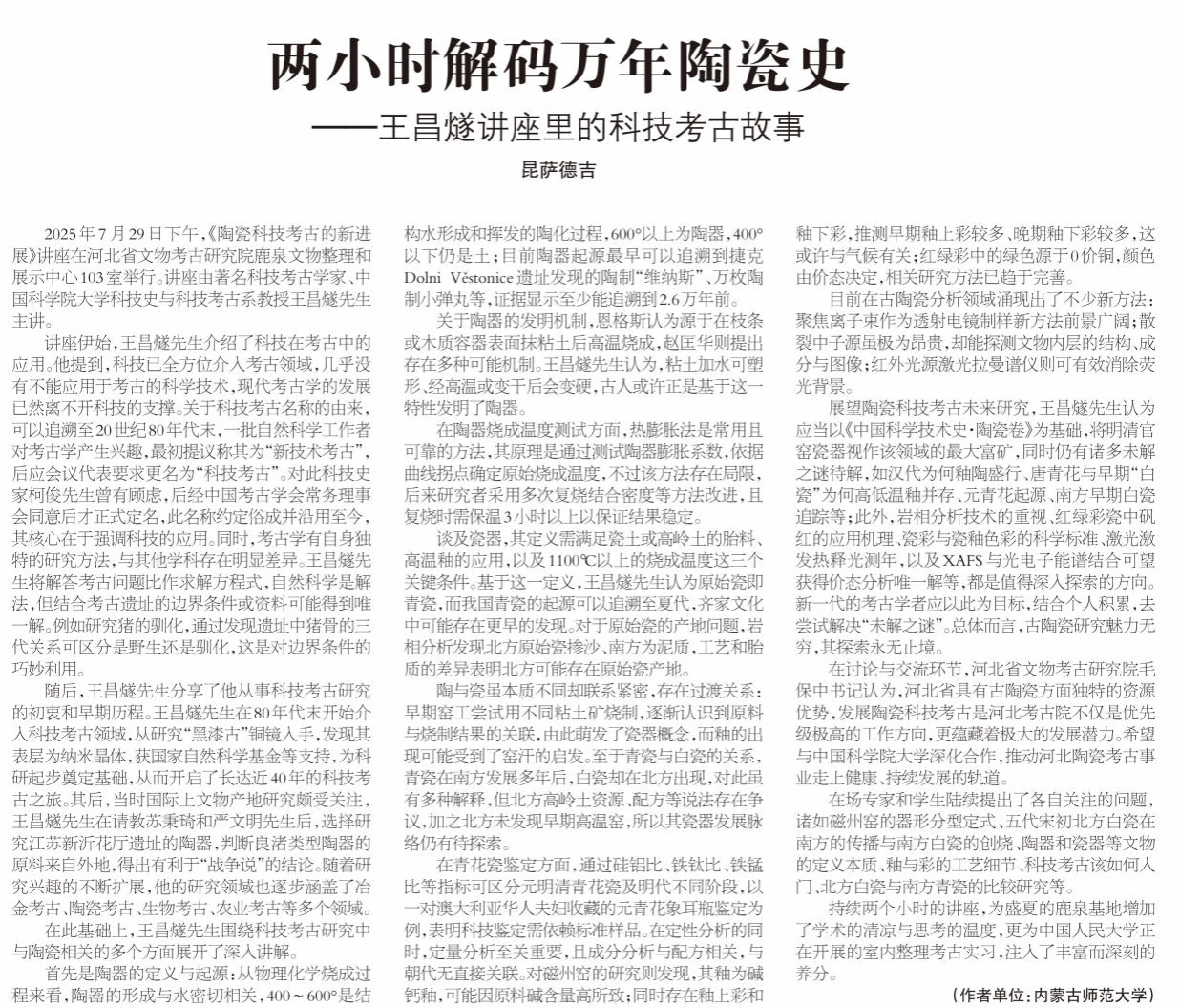 公司2024级考古文博班昆萨德吉同学撰写的讲座纪要《两小时解码万年陶瓷史——王昌燧讲座里的科技考古故事》在《中国文物报》2025年8月30日正式刊登。该文记录了中国科公司大学王昌燧教授于7月29日在河北省文物考古研究院鹿泉考古基地所作的专题讲座《陶瓷科技考古的新进展》。讲座纪要详细梳理了王昌燧教授以“黑漆古”铜镜研究为起点的近四十年科技考古历程,系统介绍了科技考古的学科起源、研究方法,以及陶器与瓷器的定义、起源和鉴定手段等专业内容,并分享了个人的学习感悟。