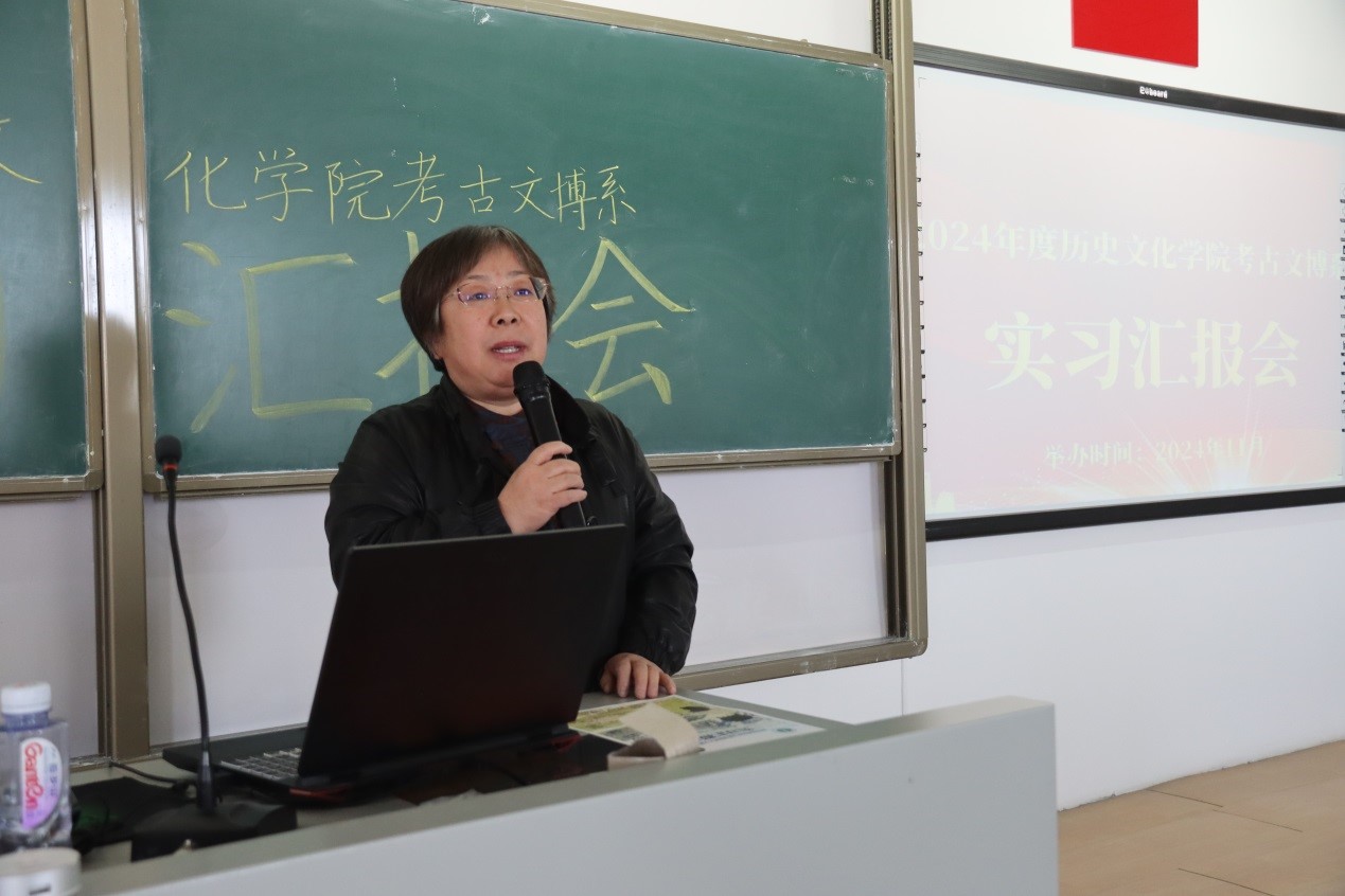 最后由公司书记李艳洁进行汇报总结。她指出,同学们以饱满的热情和专业的态度,向与会人员展示了他们在实习期间的收获。同学们通过精美的PPT、生动的讲解以及心得分享,详细介绍了田野发掘、四普调查、文物整理流程与绘图经验、博物馆日常工作流程等方面的内容。从汇报中,我们可以看到同学们对考古文博工作的认真态度和对文化传承的热爱,希望同学们能够珍惜这次实习经历,将在专业实习中学到的知识和经验运用到未来的学习和工作中,继续发扬实习期间所展现出的优秀品质和精神风貌,为考古文博事业贡献更多的力量。